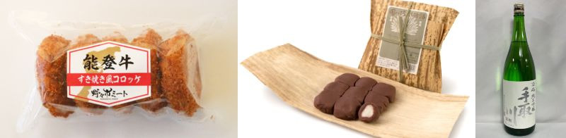 【石川県】(左から) サニーサイド 能登牛コロッケ / 圓八 あんころ餅 / 吉田酒造 手取川 酒魂 純米吟醸 720ml