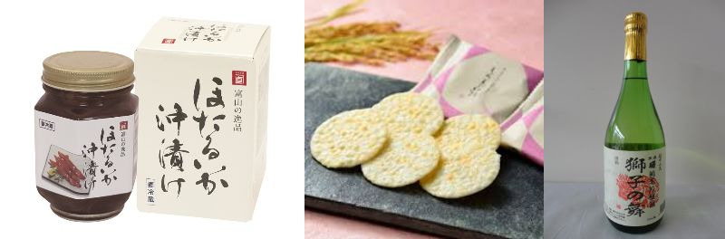 【富山県】(左から) 川村水産 ほたるいか沖漬けプレミアム / 日の出屋製菓 白えび紀行 / 高澤酒造場 曙 獅子の舞 純米吟醸 720ml