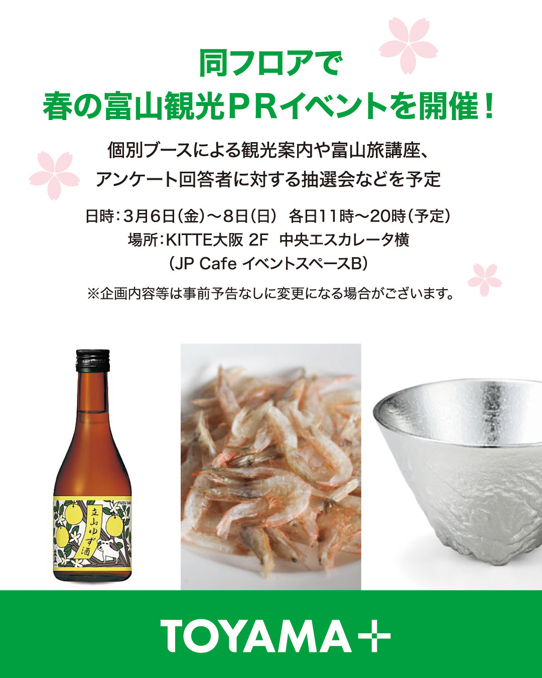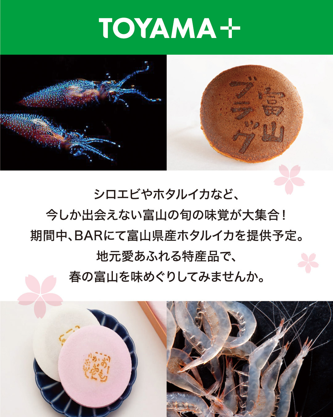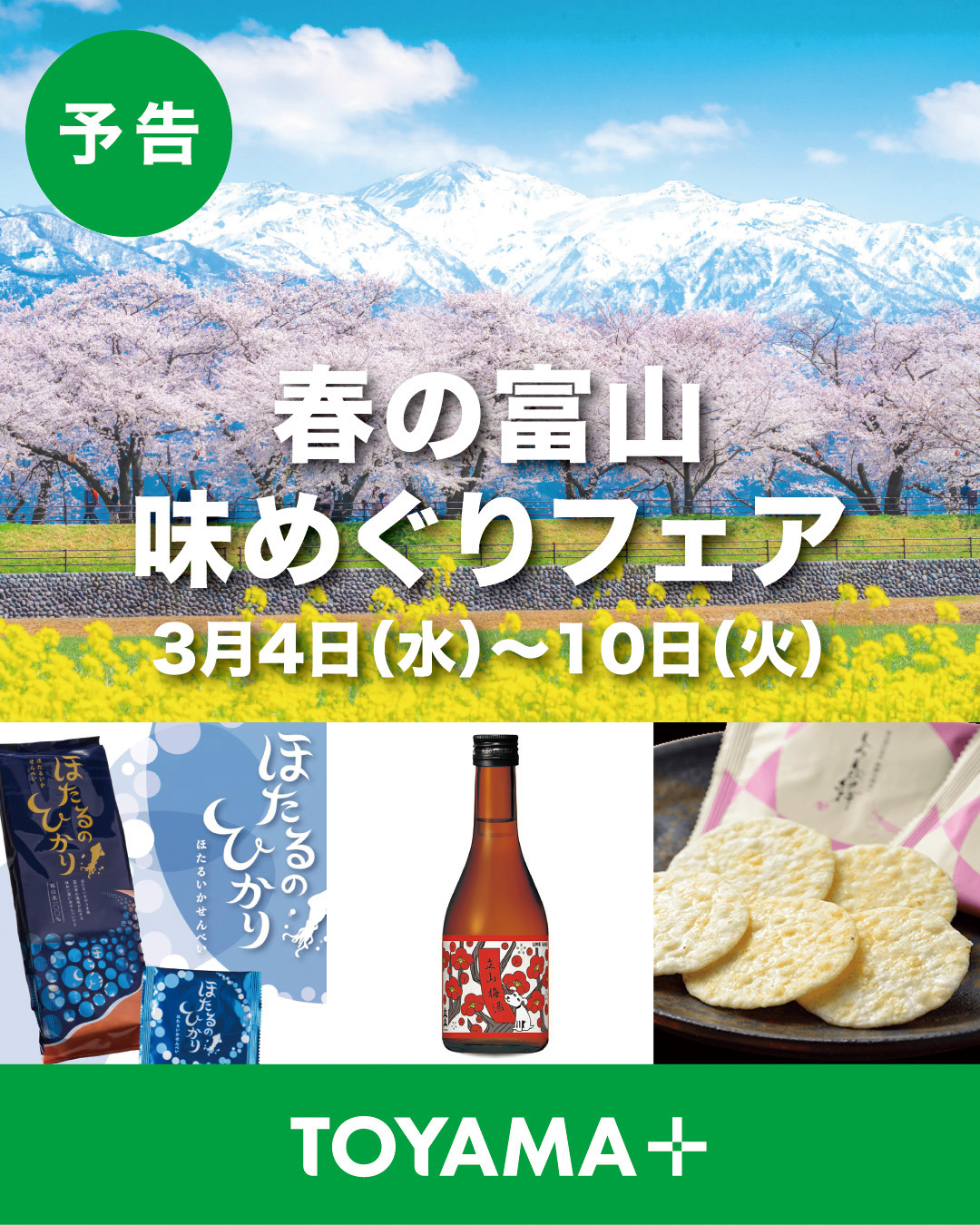 春の富山 味めぐりフェアを開催します! 2026.02.24 イベント New Check 富山県 3/4(水)〜3/10(火)は、春の富山 味めぐりフェア を開催します!※企画内容等は事前予告なしに変更になる場合がございます。